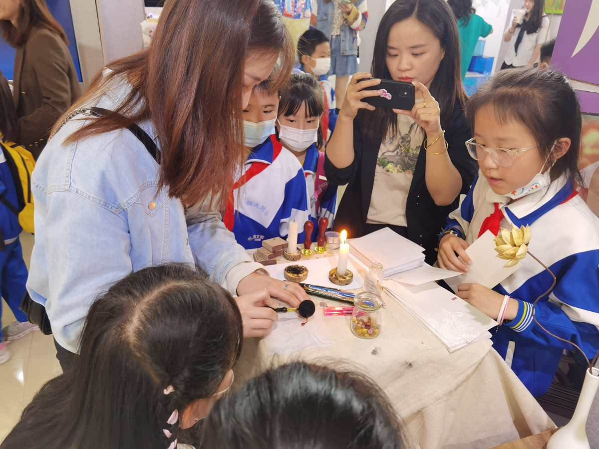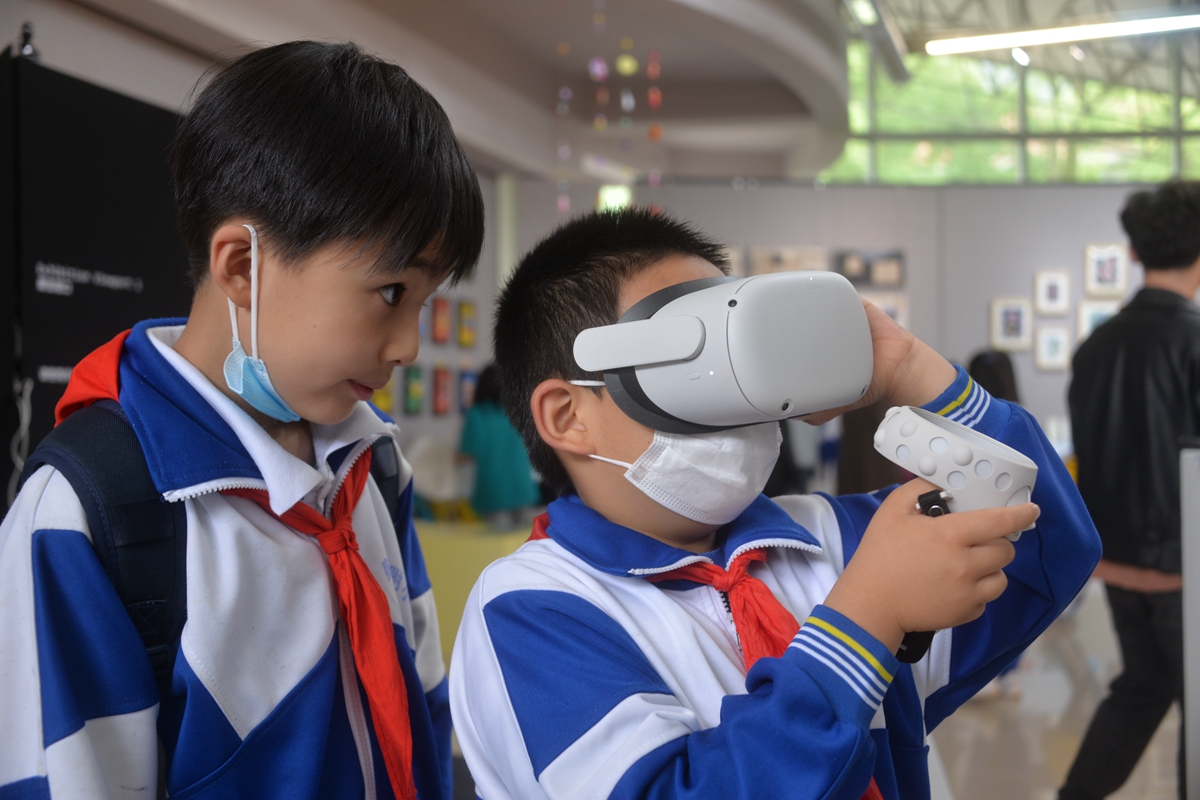 启动仪式结束后,师大附小的萌娃们在美院大哥哥大姐姐的带领下参观了数字媒体作品展和视觉传达作品展。观展过程中,孩子们被各种美轮美奂的数媒艺术作品吸引,发出连连惊叹,在可沉浸式体验的视觉传达作品装置中流连忘返……