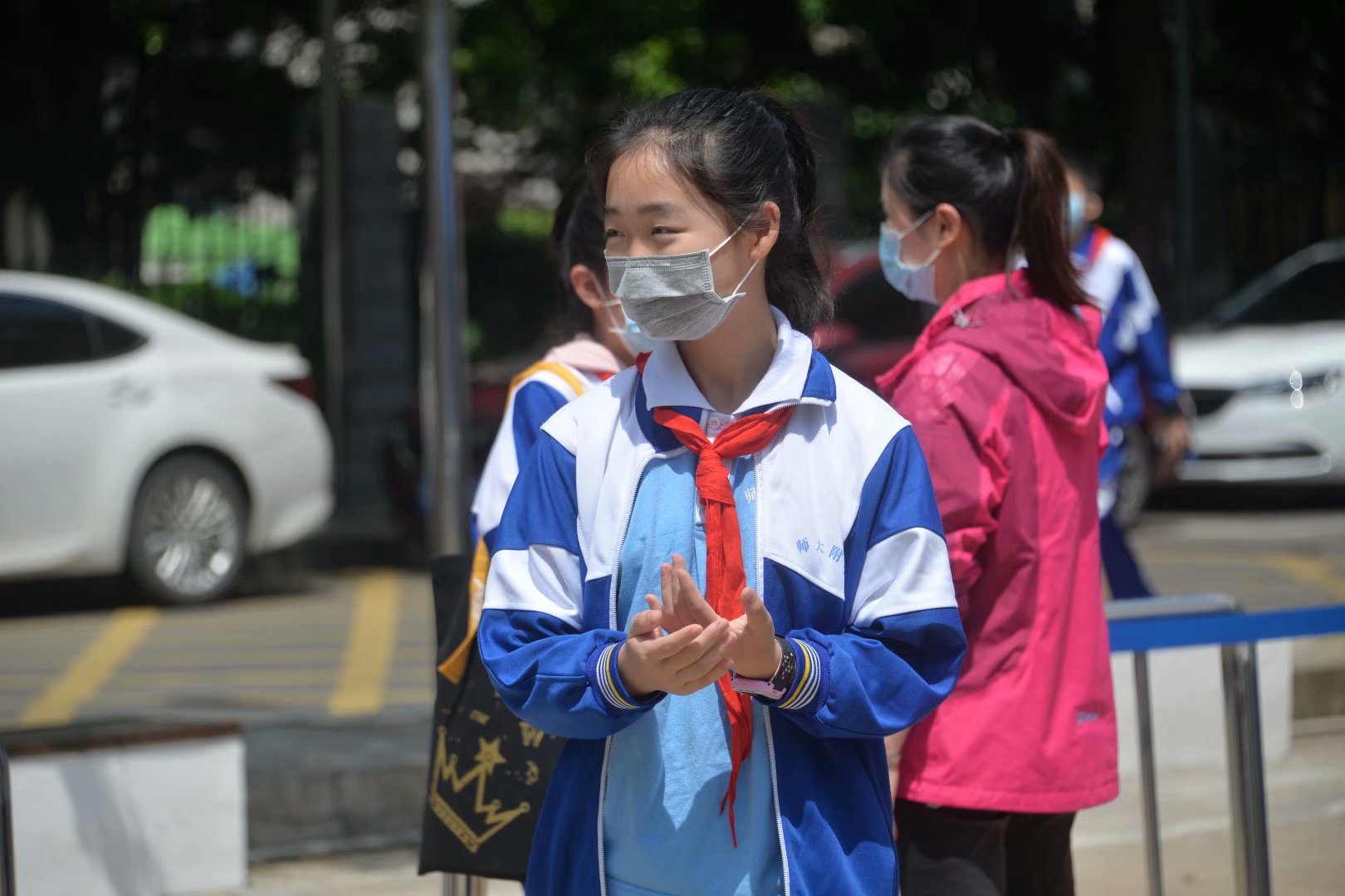 七点五十,入校学生开始增多,但防疫措施丝毫不马虎。为保证学生能快速安全通过,学校开放了七条检测通道,老师指引孩子们间隔一米排队、帮助孩子们用免洗洗手液消毒双手,体温检测正常的学生有序进入校园。